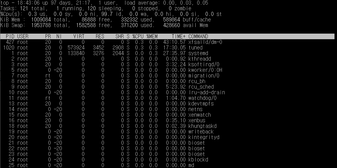 상단을 보시면 top에서는 total, running, sleeping 등의 정보를 제공하지만