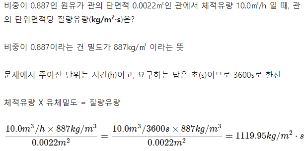8. 비중이 0.887인 원유가 관의 단면적이 0.0022m2인 관에서 체적 유량이 10.0m3/h 일 때 관의 단위 면적당 질량유량(kg/m2·s)은?