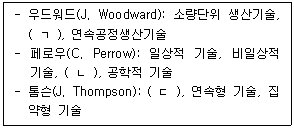 55. | 조직설계에 영향을 미치는 기술유형을 학자들이 제시한 것이다. ( )에 들어갈 내용으로 옳은 것은? |