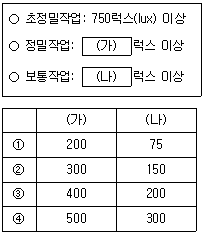 10. 「산업안전보건기준에 관한 규칙」상 근로자가 상시 작업하는 장소의 작업면 조도(照度) 기준으로 (가), (나)에 들어갈 숫자를 바르게 연결한 것은? (단, 갱내(坑內) 작업장과 감광재료(感光材料)를 취급하는 작업장은 제외한다)