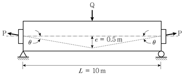 8. 그림과 같이 지간 중앙에 집중하중 Q=50kN이 작용하는 프리스트레스트콘크리트 단순보의 지간 중앙에서 휨모멘트의 크기[kNㆍm]는? (단, 프리스트레스 힘 P는 100kN이고, sinθ≃tanθ 이며, 보의 자중과 프리스트레스 손실은 무시한다)