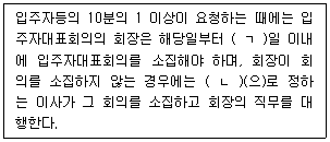 2. 입주자인 동별 대표자 중에서 회장 후보자가 없는 경우로서 선출 전에 전체 입주자 과반수의 서면동의를 얻더라도 사용자인 동별 대표자는 회장이 될 수 없다.