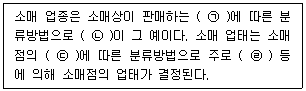 1. ㉠ 상품군, ㉡ 의류점, ㉢ 마케팅 전략, ㉣ 판매방식