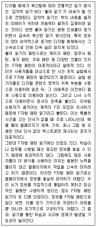 2. F자형 패턴 읽기는 디지털 매체에서 정보가 배치된 모양에 따라 붙여진 이름이다.