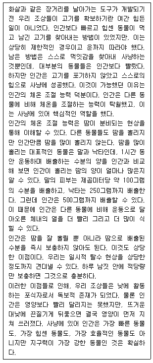 5. 인간은 다른 동물에 비해 피부의 제곱미터당 흘릴 수 있는 땀의 양이 많아 운동으로 인해 발생한 열을 식히는 데 더 유리하다.
