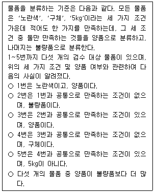 4. 1~5번 중 노란색인 물품은 모두 양품이다.