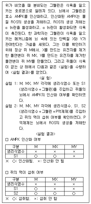 2. 그렐린이 AMPK를 인산화할 때 X가 필요하고, 인산화된 AMPK가 ROS의 생성을 저해할 때 Y가 필요하다.