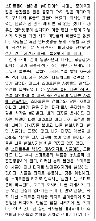 5. ㉤을 “스마트폰을 타자로 인식하는 순간 내 삶의 영역은 이전보다 확장된다”로 수정한다.