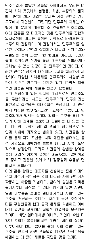 4. 민주주의가 발전하기 위해서는 대표자의 일방적 의사결정이 아닌 시민의 정치적 의사결정이 더 존중되어야 한다.